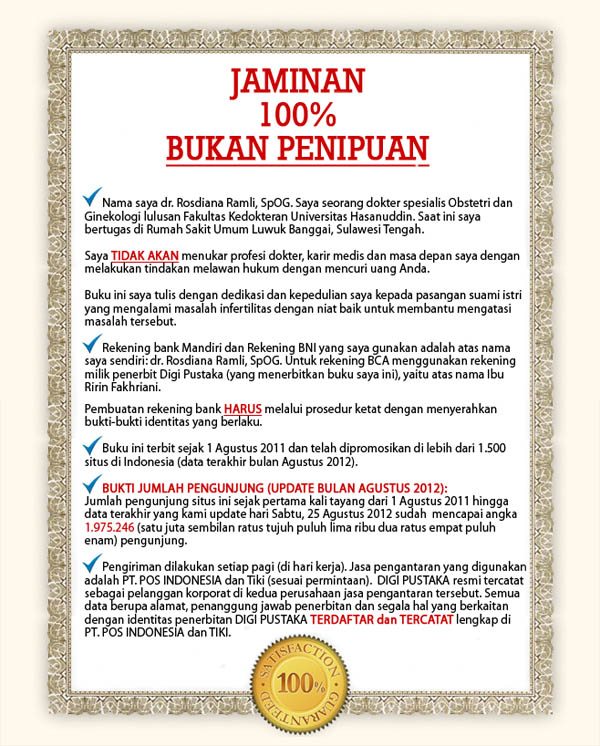 “Setelah saya membaca buku ‘Panduan Lengkap Cara Cepat Hamil’ dan mengikuti kiat dan anjuran dalam buku ini, syukur Alhamdulillah sekarang saya sudah HAMIL 7 bulan.”
